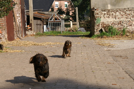 Dies sind unsere beiden Wachhunde Kira und Maja, (es sind zwei Dackel, was man hier kaum erkennen kann) im Anflug auf die Fotografin. Leider ist unsere Maja inzwischen verstorben.